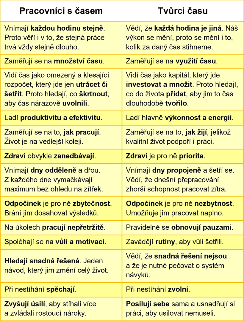 Hledá, co do života přidat, aby nám to čas tvořilo. Přidává návyky, které zvýší energii i výkon, a tím přirozeně urychlí naši práci.